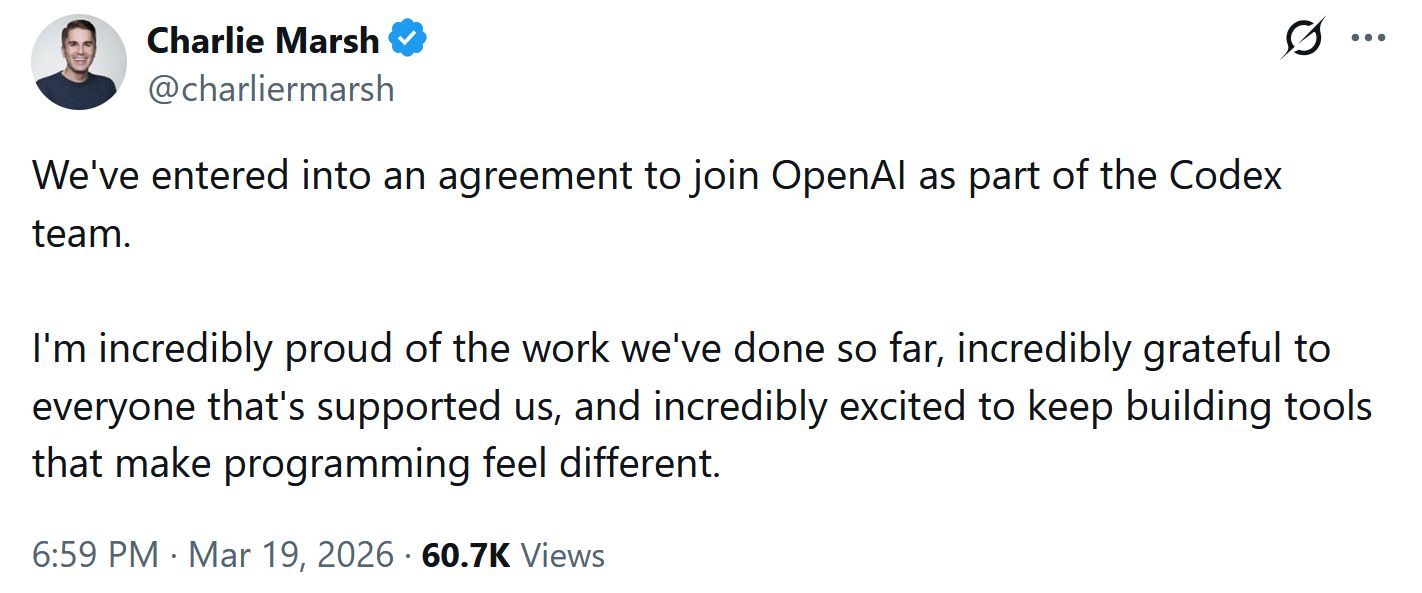 Whoa, whoa, whoa. The darling of the Python ecosystem, the team that brought us ruff, uv, ty and pyx and forever changed the python tooling landscape is now joining OpenAI.